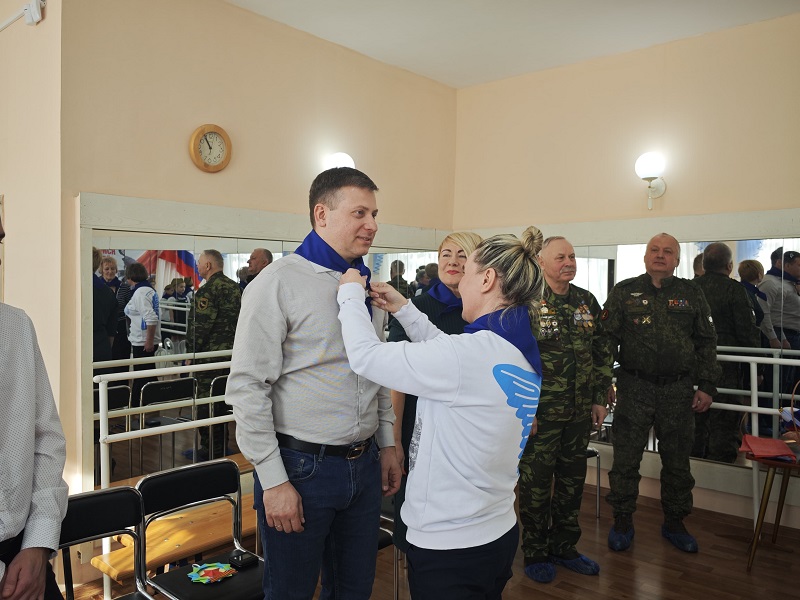 Символ патриотического течения – голубой галстук – повязали и на шею Евгений Викторовича, таким образом приняв его в ряды «Внуков Победы».