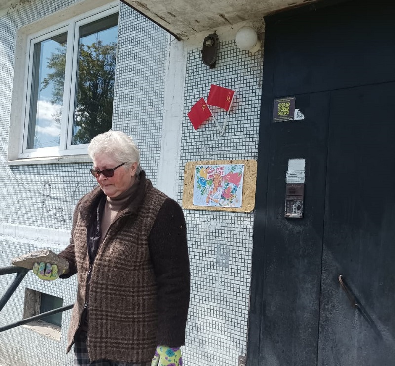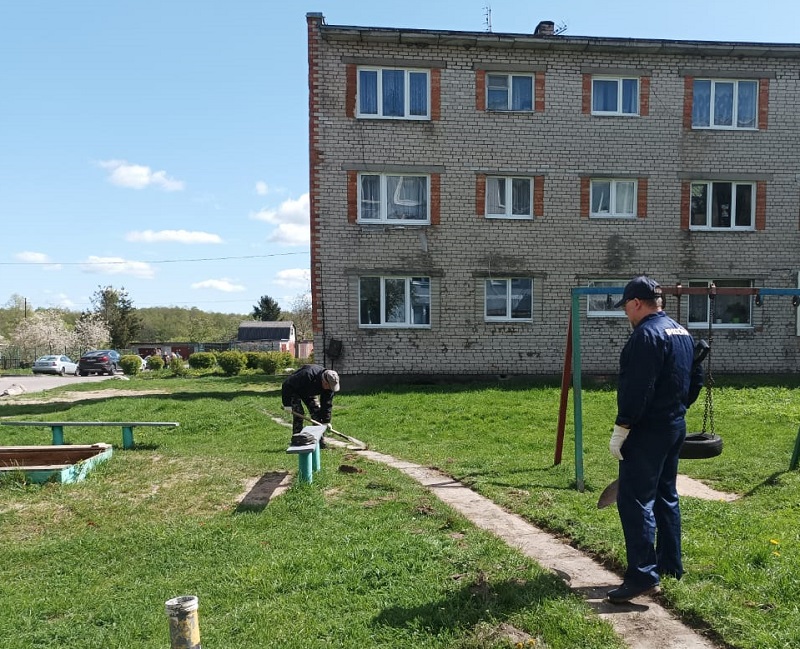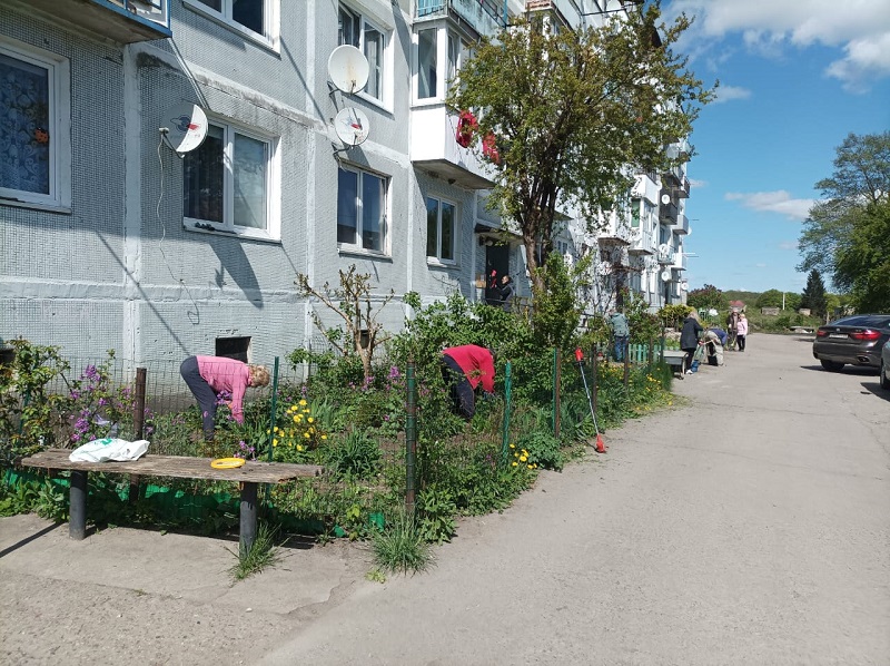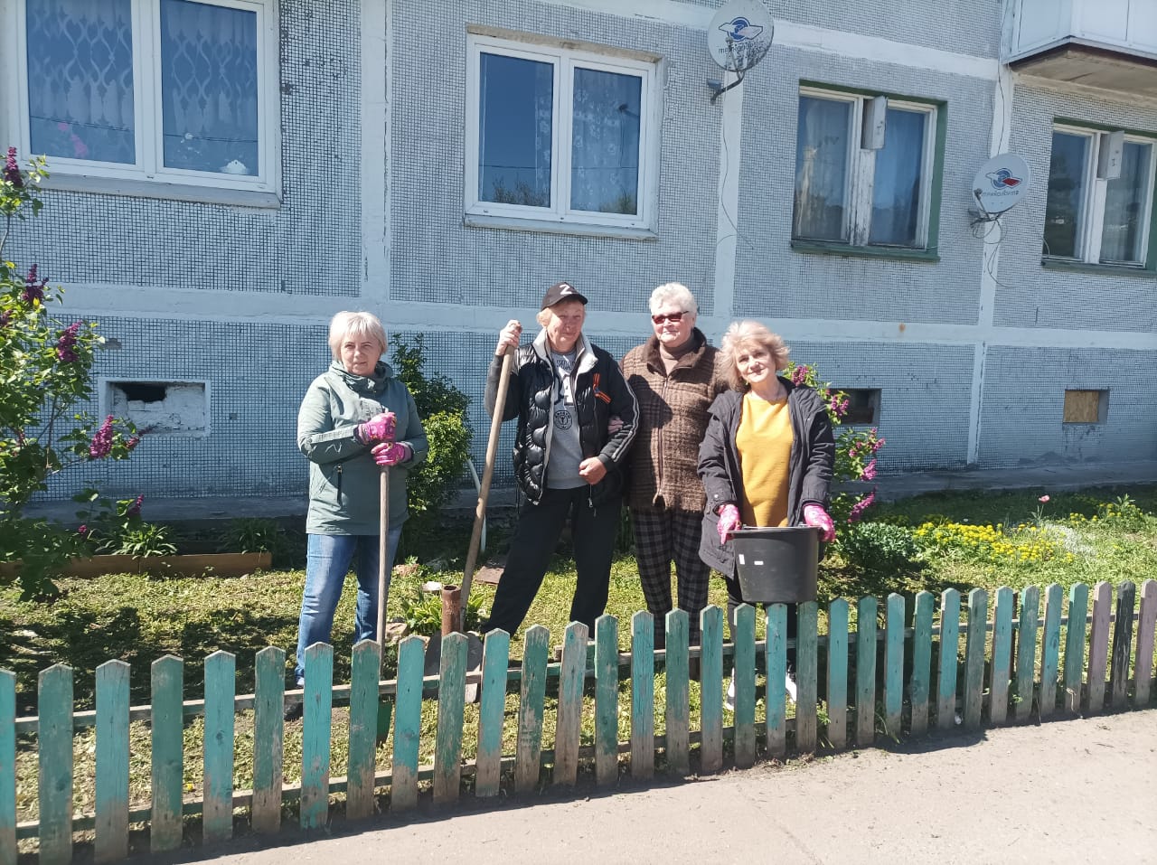 Участники субботника активно очищали дорожки, побелили деревья и подготовили территорию к праздникам, где украсили дома флажками к 1 мая.