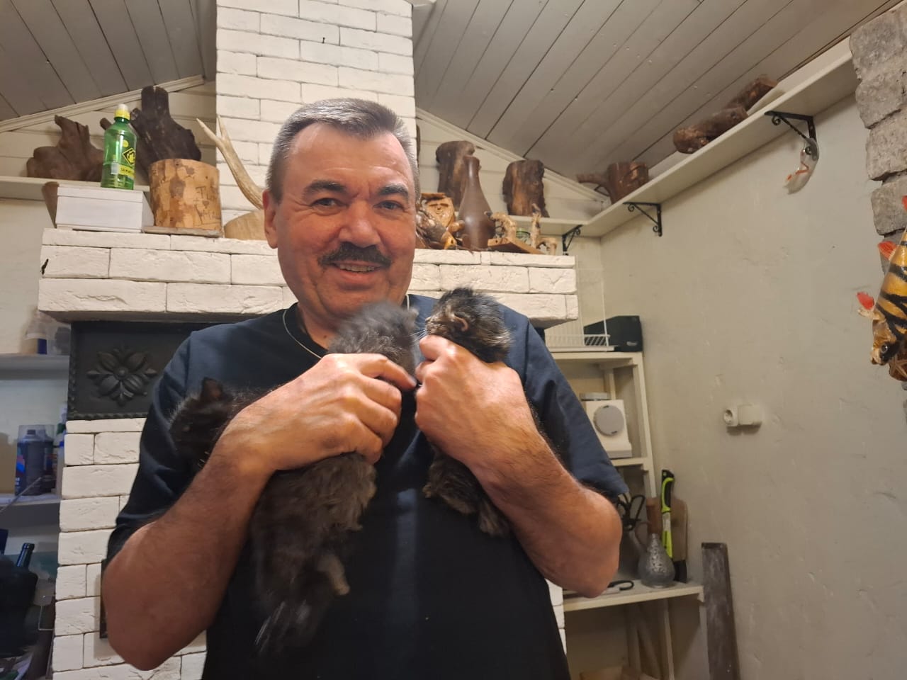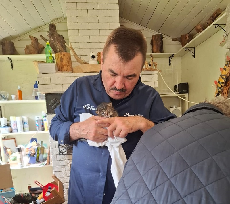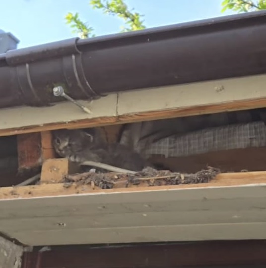 Примерно месяц назад партиец заметил, что на территорию их участка зачастила кошка, которая избегала контакта и игнорировала корм. Однако недавно, услышав плач котят с крыши своего летнего домика, он и его семья решили посмотреть, что произошло. С помощью своего помощника Владимир Мигуленко разобрал карнизную планку и обнаружил там троих котят, которые находились в плохом состоянии: худые, голодные, с больными глазками.