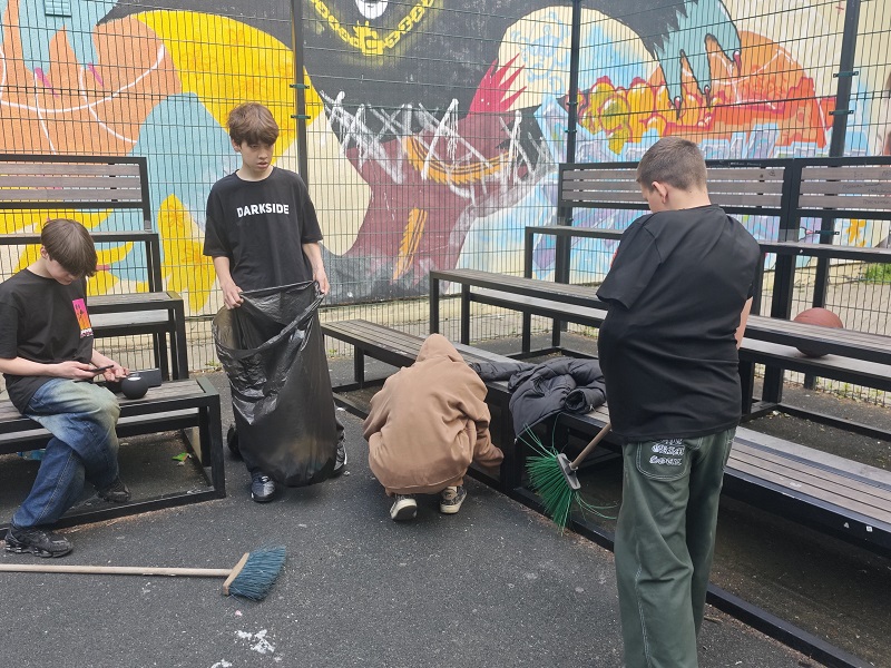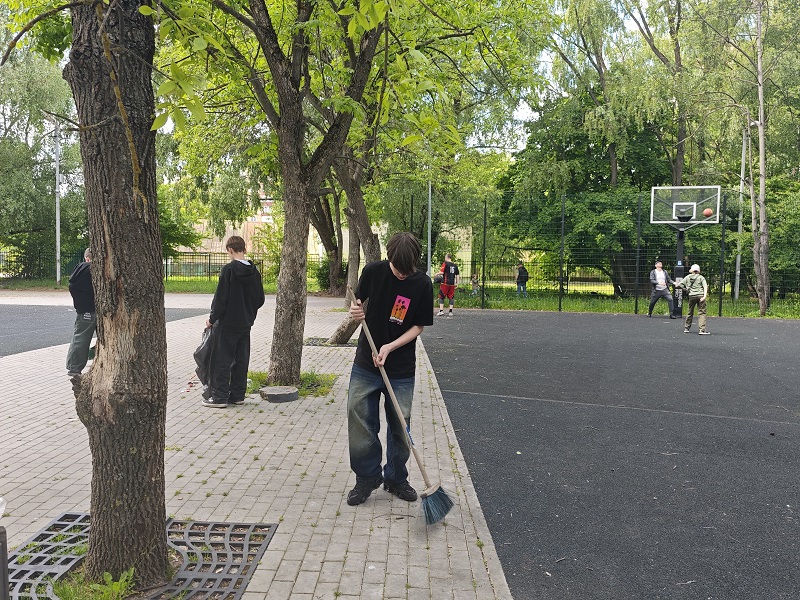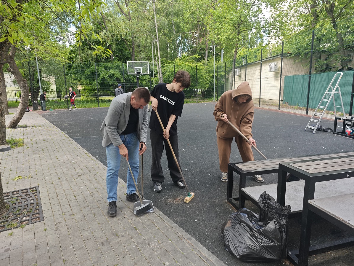 Вооружившись метлами, совками и другими инструментами, школьники вместе с координатором ЛДПР начали приводить территорию в порядок. Владимир Мигуленко на свои личные средства закупил сетку для баскетбольного кольца и клей для ремонта сломанного теннисного стола.