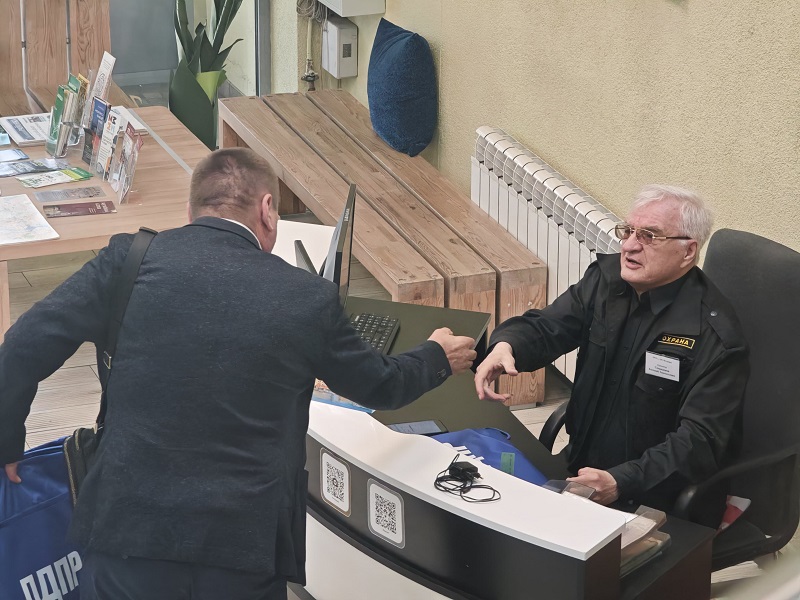 Интересный момент произошел с охранником, который поначалу насторожился из-за визита непрошенных гостей. Однако, увидев родную символику партии, он неожиданно обрадовался и рассказал, что является членом ЛДПР с 1996 года из Новосибирска.