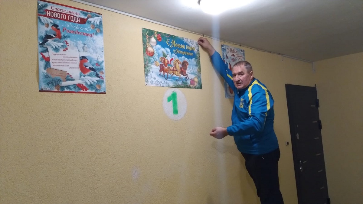 Координатор Ленинградского района города Сергей Плужник лично приступил к украшению подъездов многоквартирных домов красочными новогодними плакатами, чтобы создать для жителей волшебную атмосферу.
