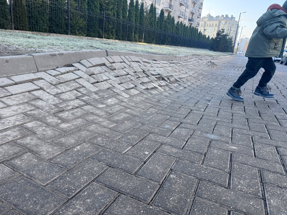 Дорожное покрытие на этом участке выполнено из тротуарной плитки, которая не выдержала интенсивной нагрузки от движения транспорта. На отдельных участках плитка разбита, а в двух местах её выдавило почти на 40 сантиметров, из-за чего поднялись бордюры.