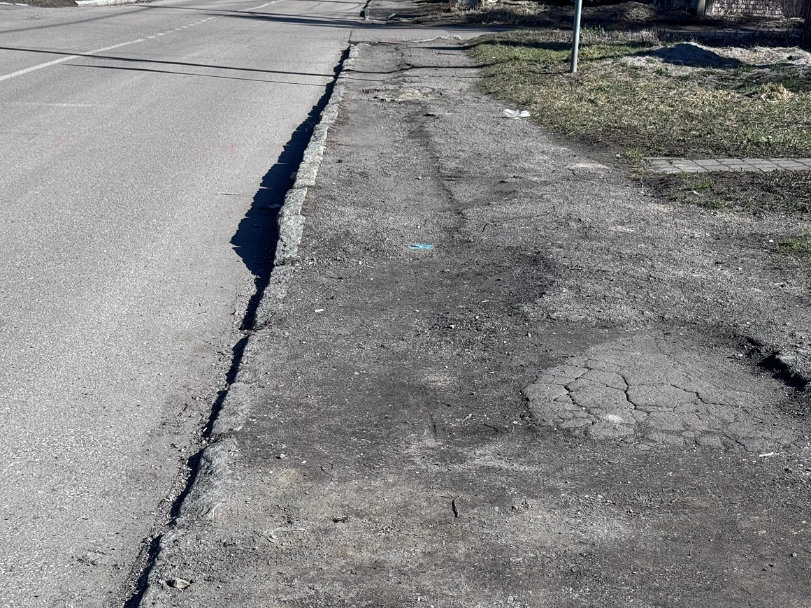 Ситуация критическая: пешеходная зона полностью разрушена. Пройти по тротуару невозможно ни пешком, ни с детской коляской. Особенно опасно передвигаться здесь в тёмное время суток.